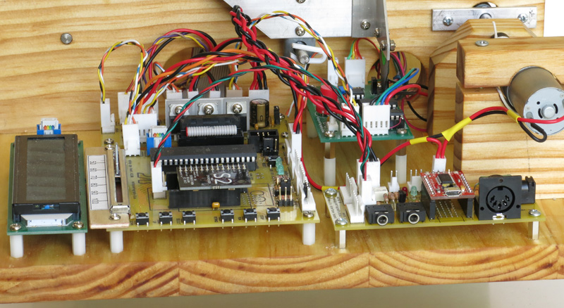 The image shows Version 1. However, the basic layout for the version 2 is similar. The strip LED light for illumination of the sensors is above the paper. The leads on the right are 12 volt supply in and line level audio out.