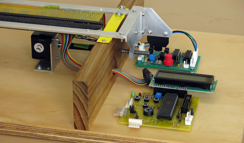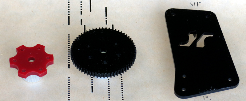 The takeup roller in version 1 was fixed to the axle and the axle was driven via a chain sprocket. To avoid bearings and alignment difficulties a simpler arrangement was used for version 2. The roller free runs on the axle and is driven directly with a toothed belt. Alignment problems are avoided by the use of laser cut components. In the image above from left to right – a spacer (1 of 2) to locate the aluminium tube forming part of the takeup roll, a 3 mm pitch toothed belt sprocket that is also part of the takeup roll and a side support (1 of 2) for the LED strip light that provides the illumination for the optical sensors.