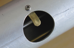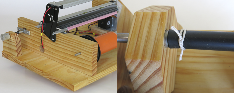 The image to the right shows detail of the takeup roll hook. The cut-out provides a lower profile when the roll is attached. The 6 mm fixed axle and one of the three assembly rods can be seen within the aluminium tube.